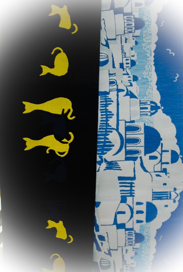 半巾帯リバーシブル アウトレット ネコ柄 紺地/金茶×黒 ギリシャ柄 ウスグレー地/青濃淡 212-478 ネコ柄に色段があります(大) 生地端30cmのところなので切り捨てて仕立て直しが可能です。 その場合、出来上がりの長さが420cmとなります。 ギリシャ柄にヨコ糸抜けがあります(小) 長さ約440cm 巾約17cm 正絹100% 「お仕立て済商品」 1~2日営業日で発送します。